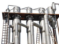 多效蒸發(fā)器是用于進行低溫連續(xù)式蒸發(fā)濃縮的設(shè)備,由各效加熱蒸發(fā)器、各效分離器、冷凝器、熱壓泵、殺菌器、保溫管、真空系統(tǒng)、各效料液輸送泵、冷凝排水泵、操作平臺、電器儀表控制柜及閥門、管路等系統(tǒng)組成。